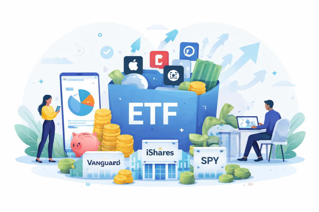 That sounds technical, but the idea is simple: an ETF is a fund that owns a collection of investments — stocks, bonds, or other assets — and trades on a stock exchange just like a regular stock.