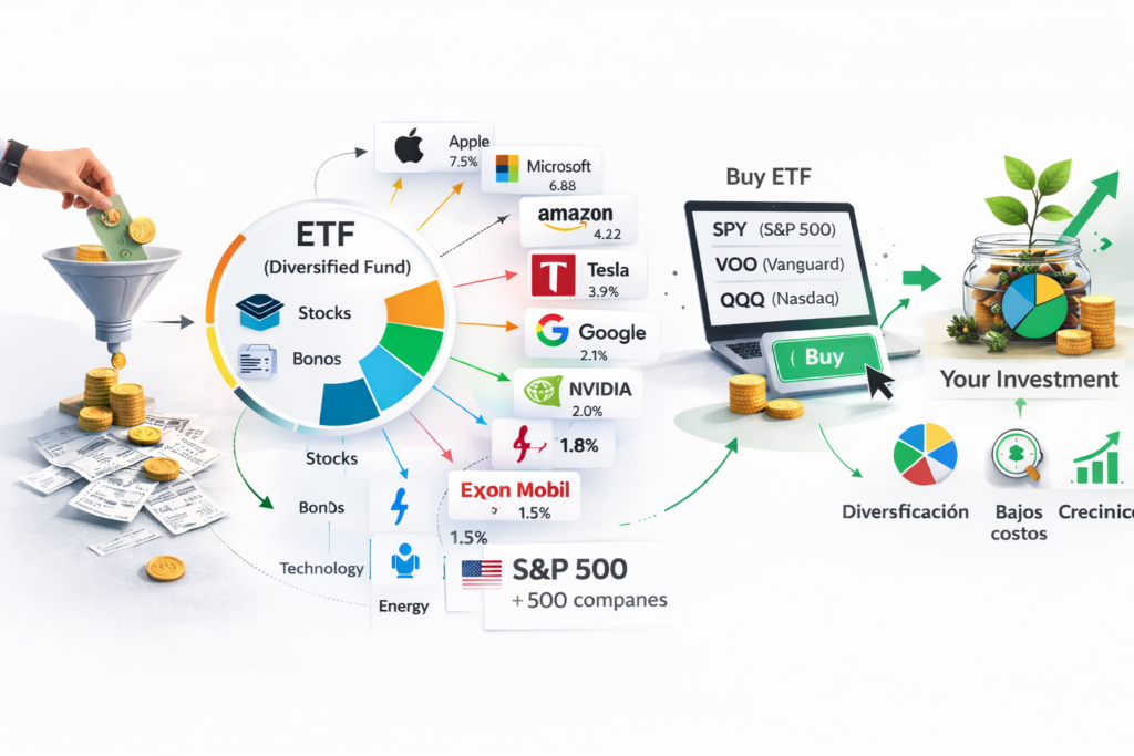 Instead of buying Apple, Microsoft, Amazon, Google, and hundreds of others one by one, you can buy one ETF that already holds them.